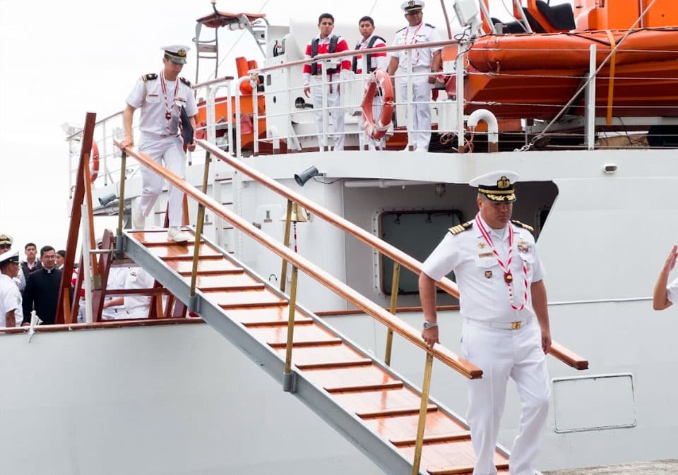 Capitán Juan José Roncagliolo Gómez, comandante del B.A.P. “Unión, es recibido protocolarmente por el comisionado Luis Rodríguez, director nacional de docencia del Servicio Aeronaval.
