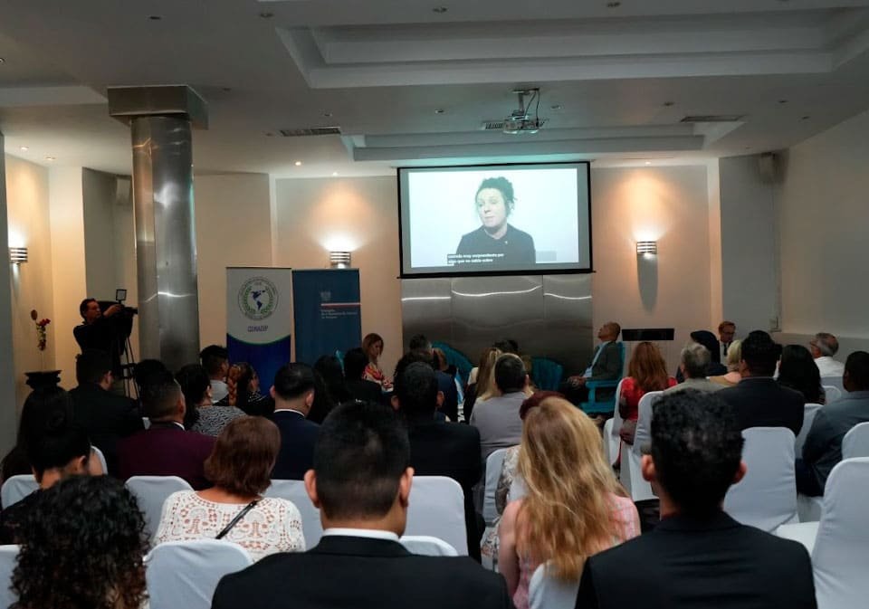 S.E. Izabela Matusz, embajadora de la Unión Europea en Panamá; S.E. Candelario Reyes García, embajador de la República de Honduras en Panamá; S.E. Amanda Martínez, embajadora de Barbados en Panamá; Liza Pinzón, presidenta del Conadip; S.E. Jolanta Janek, embajadora de la República de Polonia en Panamá y participantes del encuentro.