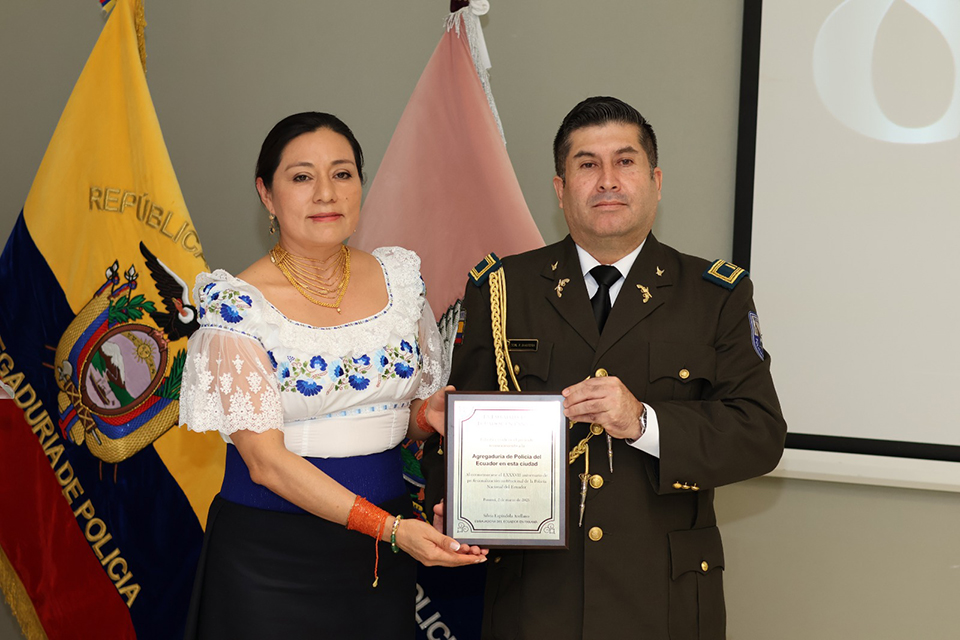 La S.S. Verónica Barahona, Encargada de Negocios de la Embajada del Ecuador en Panamá, y el Teniente Coronel Paúl Henry Saavedra, Agregado Policial, presidieron la Sesión Solemne conmemorativa del 87° aniversario de la profesionalización y 179 años de institucionalización de la Policía Nacional del Ecuador. En este evento se destacó el papel fundamental de la Policía en la construcción de una sociedad más justa y democrática, reafirmando su compromiso con la paz, el orden y los derechos humanos. La ceremonia contó con la presencia de representantes diplomáticos y de seguridad nacional de Ecuador y Panamá, quienes reconocieron el esfuerzo y dedicación de la institución policial.
